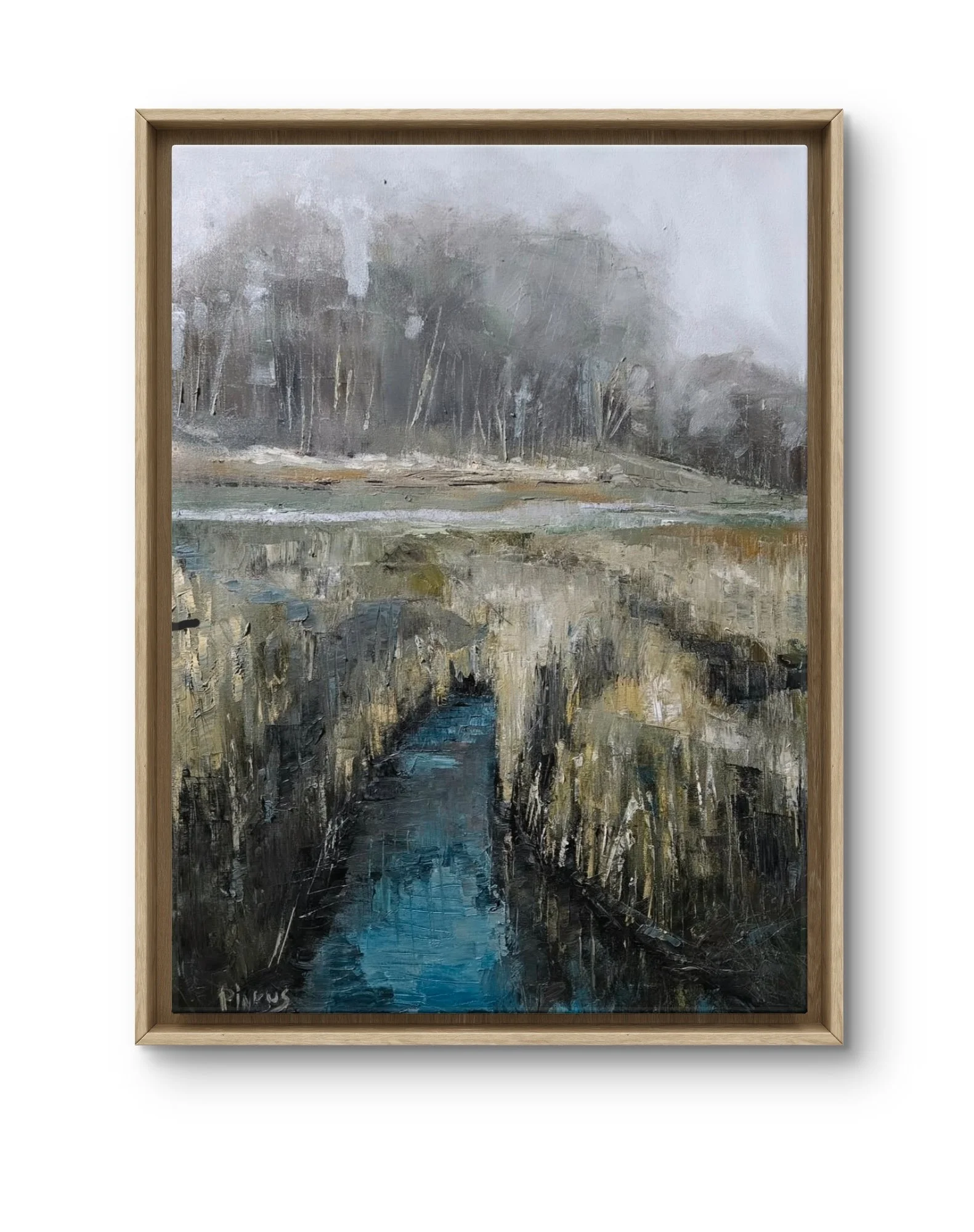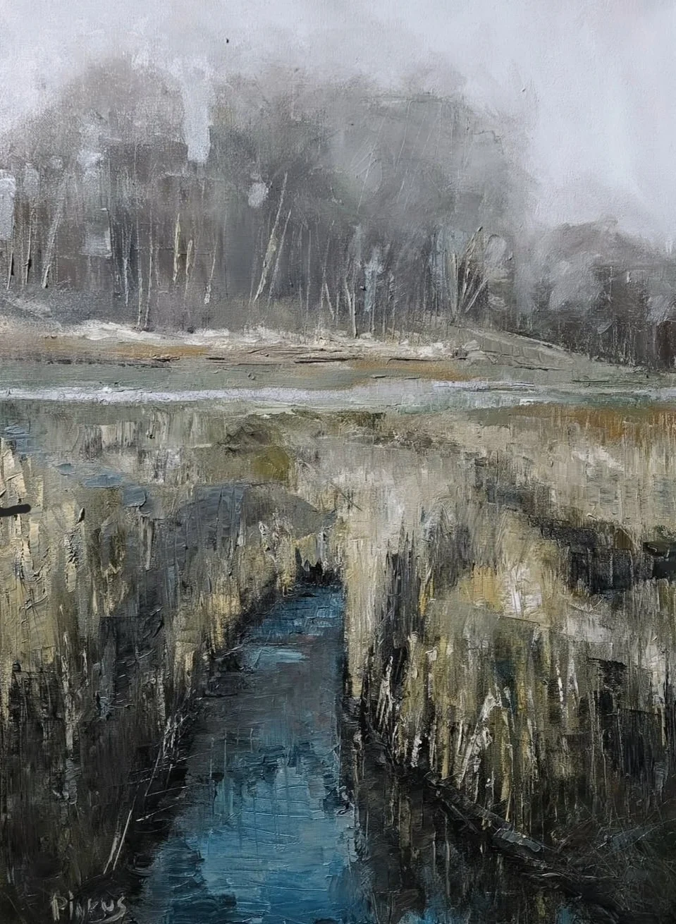 "River's End" is an expressive oil painting (18" x 24") that marks a unique exploration into a subdued Zorn Palette with deep blues. The piece is a powerful example of the artist's dedication to the Impasto technique, using palette knives to capture a dark, misty, and moody scene. It was a "palette cleanser" that allowed for raw emotion to take over, resulting in a dramatic finish where the thick, messy paint builds an intense atmosphere. This piece is offered as part of the Studio Clearance Sale to make room for new work.