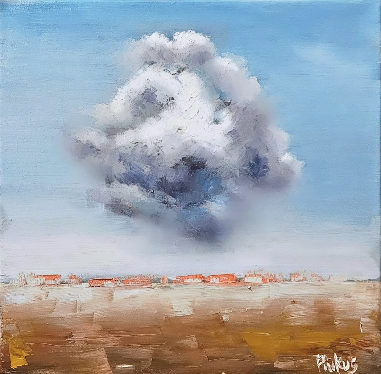 I don’t generally have a lot of clouds in my paintings, but on the way back from a trip with my wife to Prescott, AZ I took some pictures of a single, gargantuan cloud looming just above a suburban neighborhood in the distance. It was very ominous, and it really made me want to try my hand at painting this fluffy, detailed sky sentinel. Aside from the cloud, I kept the rest of the composition very simple, as to have my viewers focus on the hero of this piece.