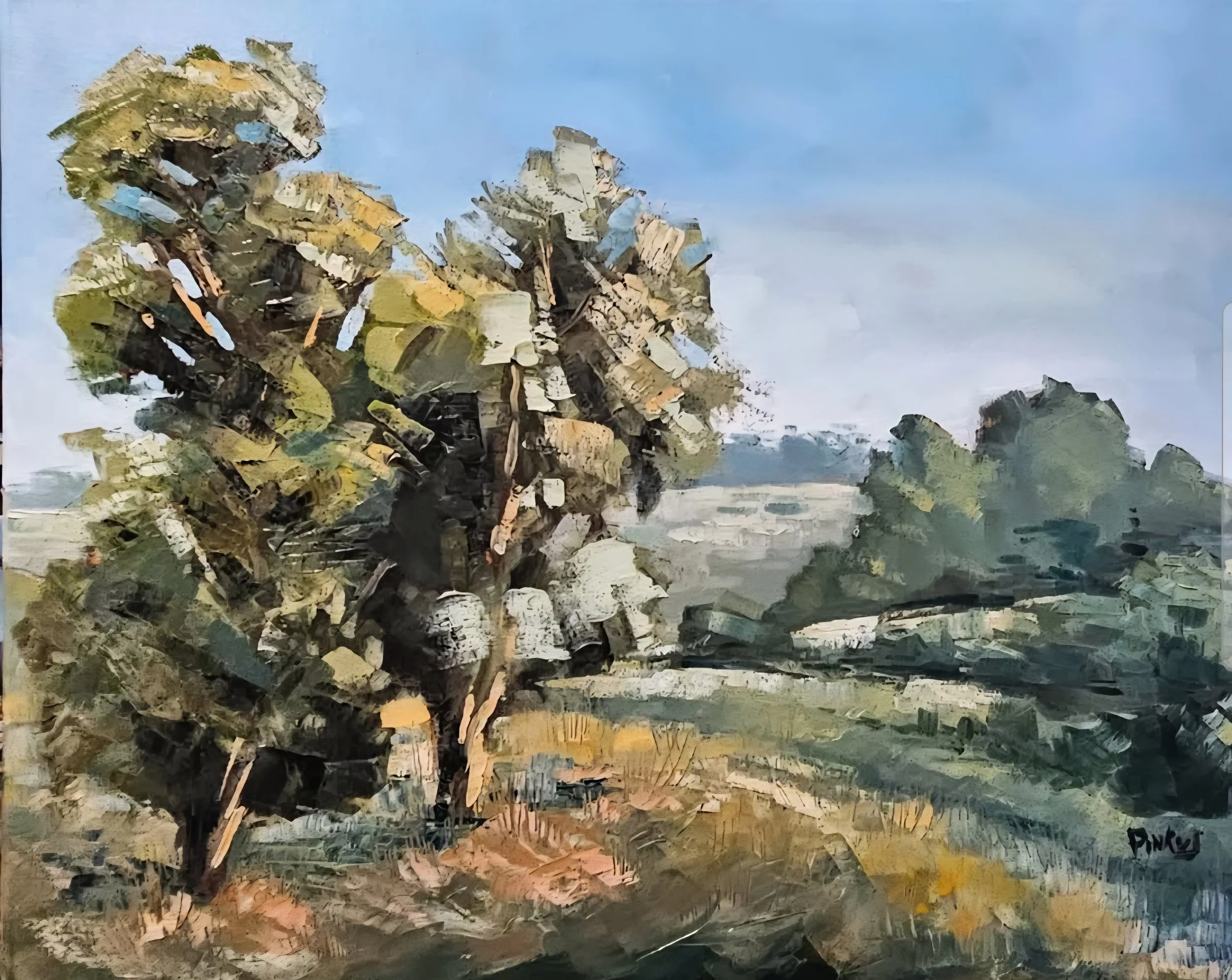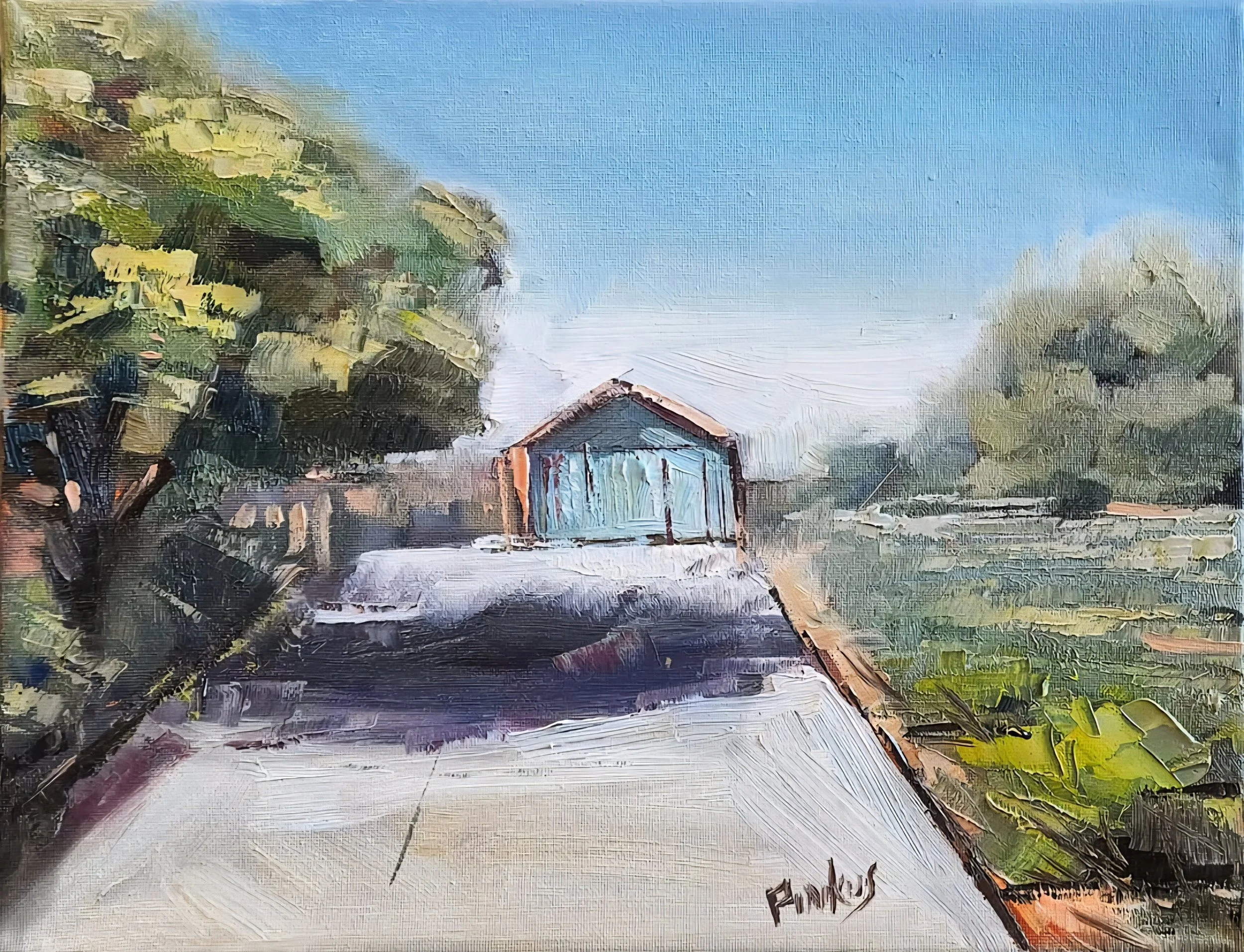 When I decided to paint a few trees I liked near my place of work, I knew I wanted to experiment a bit with form, color, perspective, and technique. I took my two trees and made a scene around them, exclusively using my palette knife for my highlights and the grass in the foreground. Some of my best work happens when I forget about the rules and just paint what I feel.
