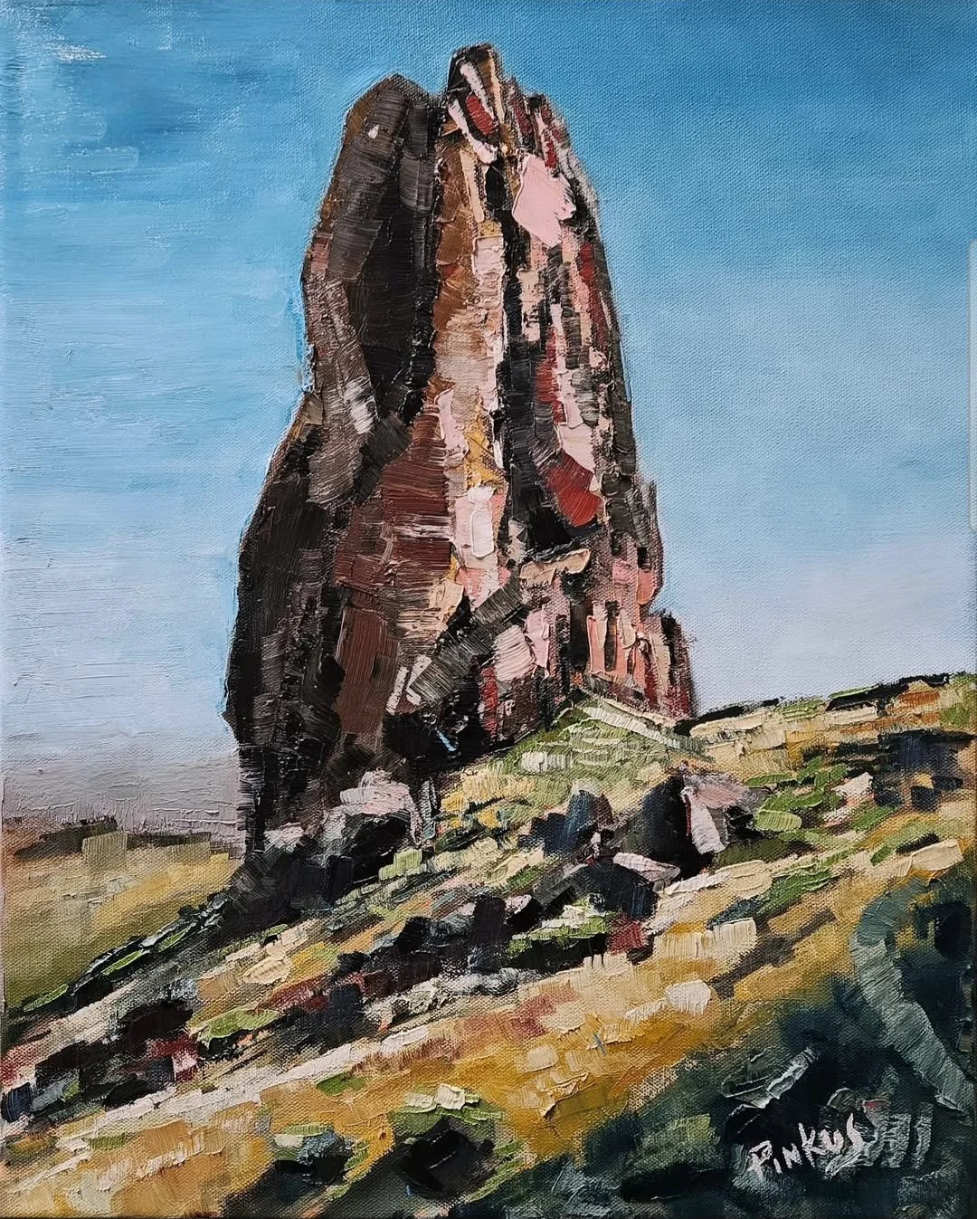 This oil painting of the famous “praying hands” rock formation in the Superstition Mountains here in Arizona was my first commissioned piece in a while. A friend from work loves hiking with his wife, and he took the picture that I used as my reference. I used my palette knife a lot in this painting, and some techniques that were new to me. I love how this turned out, and I’m so glad my hiking, adventurous friend and his wife love it too.