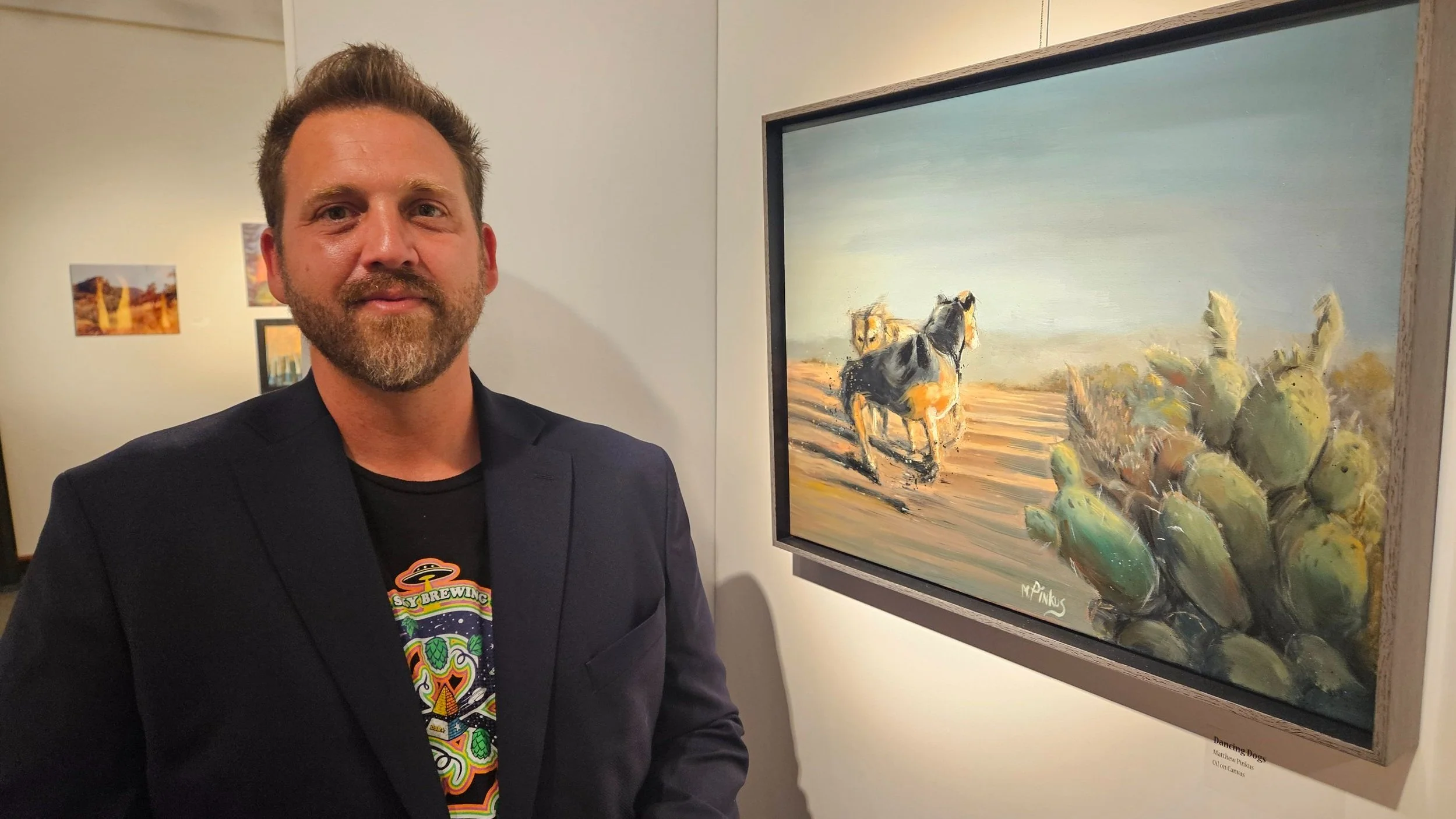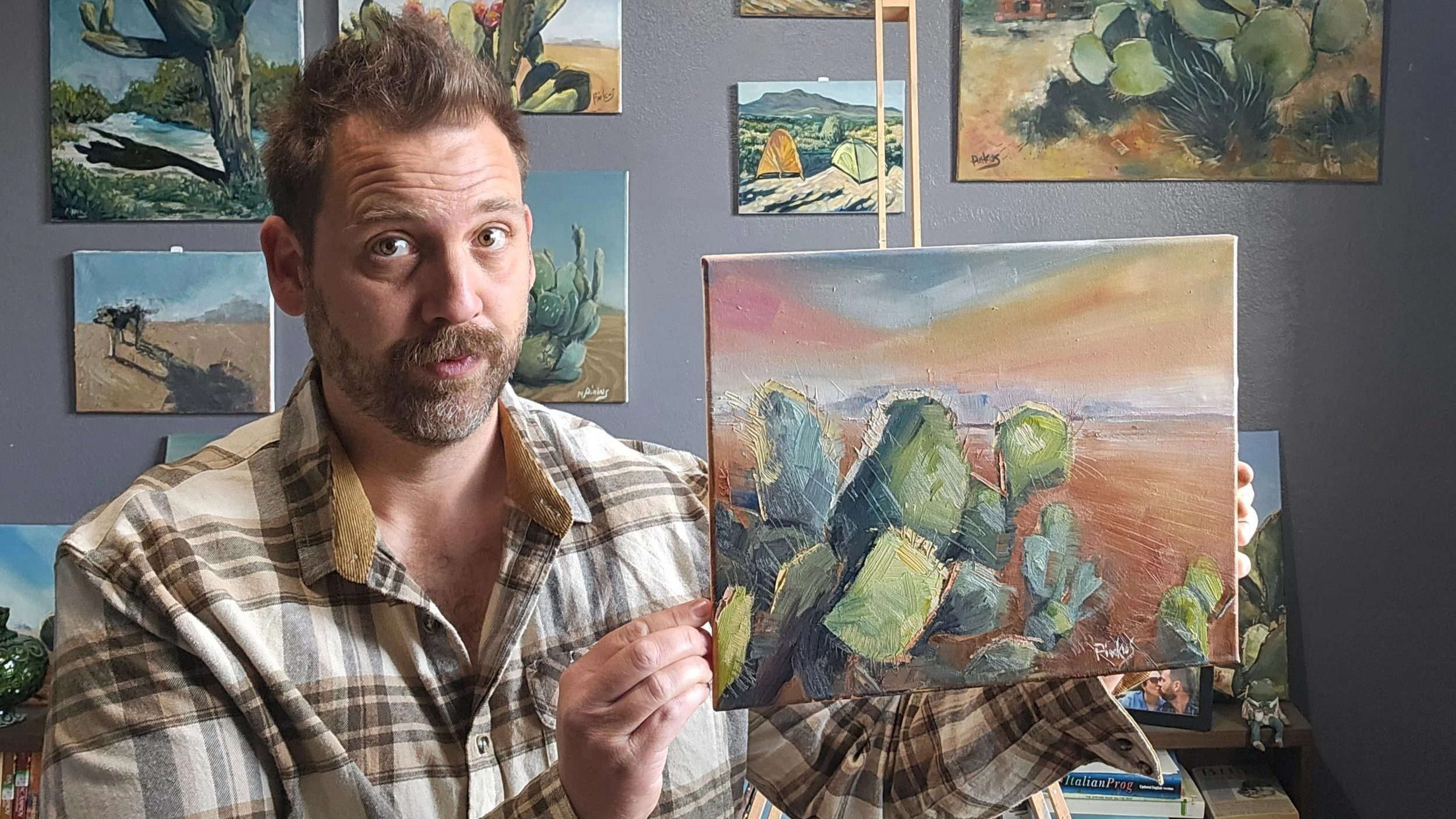 Matthew shows off his oil painting “The Crawling Pears” from his home studio in Mesa, AZ. This piece is to be featured at the Herberger Theater's Botanical Exhibit this November in Phoenix, and presents expressive textured brushstrokes, a vivid color palette, and his signature prickly pears!